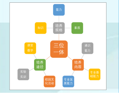 人才培养规格融“知识、能力、素质”为一体,人才培养内容融学生“通识能力、专业基础能力、专业发展能力”为一体,人才培养途径融“课堂教学、实验实训、校园文化活动”三个培养平台为一体。