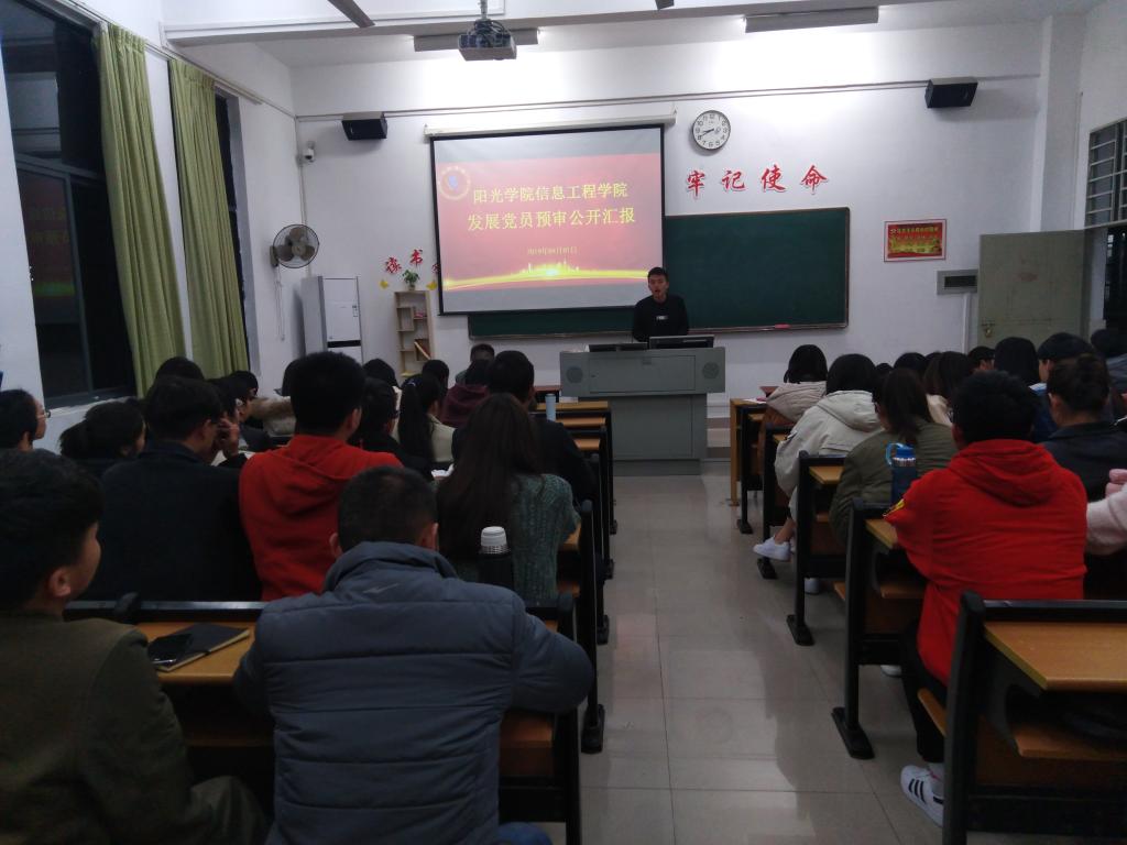 信息工程学院学生党支部于2019年04月01日在工A308、工A408开展发展党员预审汇报大会。物联网工程系学生党支部书记严绍典老师、信息与通信工程系学生党支部书记吴其枝老师和信息工程学院全体党员参加了本次会议。本次会议由严绍典老师主持。