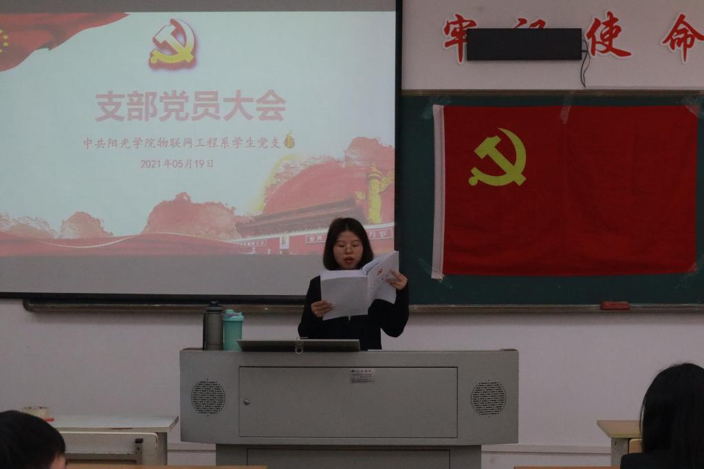 2021年5月19日、20日、21日,阳光学院物联网工程系学生党支部党员大会在工A408召开,本次大会由支部书记严绍典主持,对陈钊怡、单婷婷、潘佳冰等22名发展对象,接收为预备党员进行讨论和表决。会议在庄严的国际歌声中拉开帷幕。