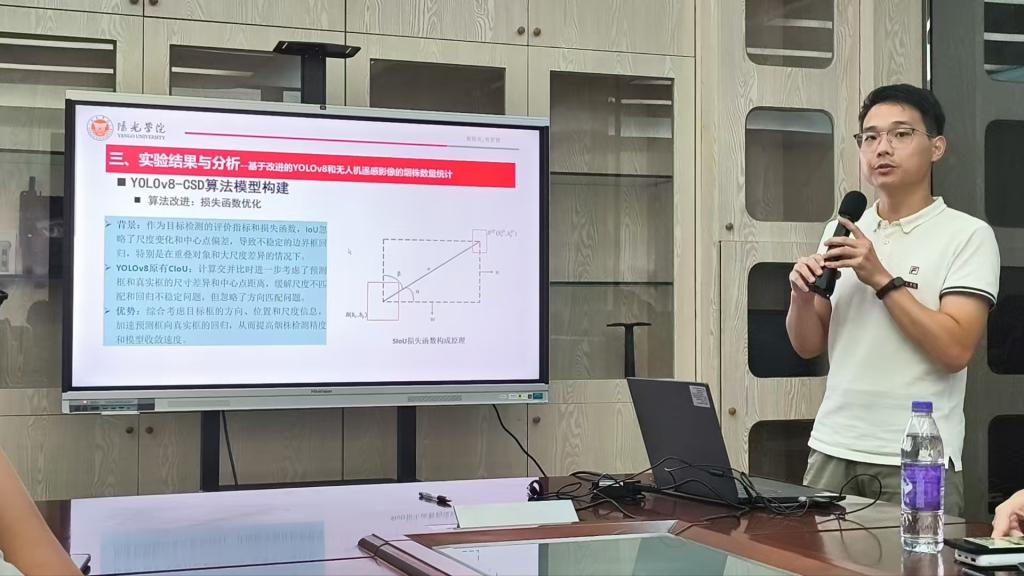 随后,杨长平老师针对烟株数量统计任务,介绍了改进的YOLOv8-CSD算法,通过坐标注意力机制、优化损失函数、增加小目标检测头及SAHI切片推理策略,有效解决了高分辨率影像中小目标密集遮挡难题,模型精确率达97.96%。此外,团队还构建了烟叶种植智能核查平台,实现烟田边界、面积及烟株数量的可视化动态监测,为智能化管理提供技术支撑。